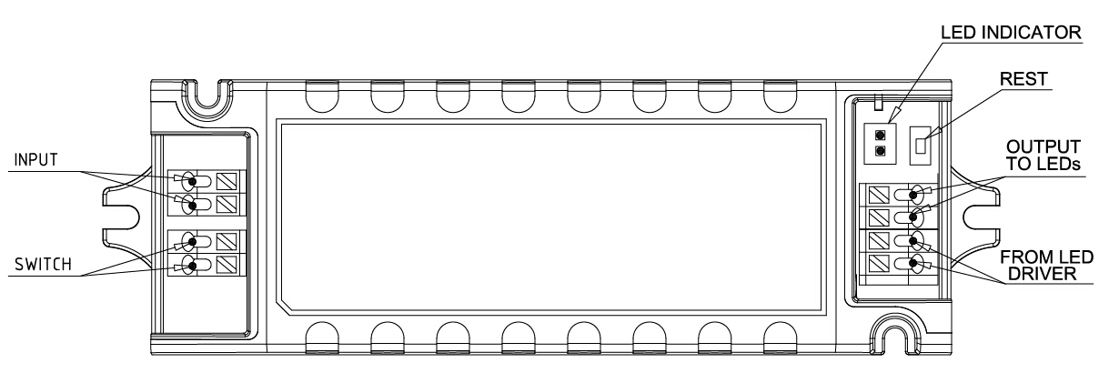 3) Emergency Simulation: Switch on E, the load lamp turns on, press the switch(TEST SWITCH), then switch to emergency mode, the indicator light of emergency driver will be extinguished. Release the switch(TEST SWITCH), then lamp is powered by led driver, the indicator light will turn on.
